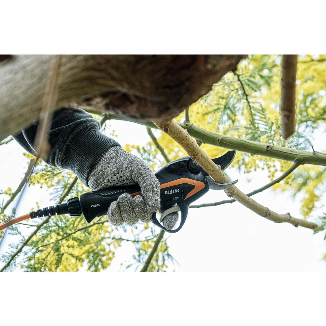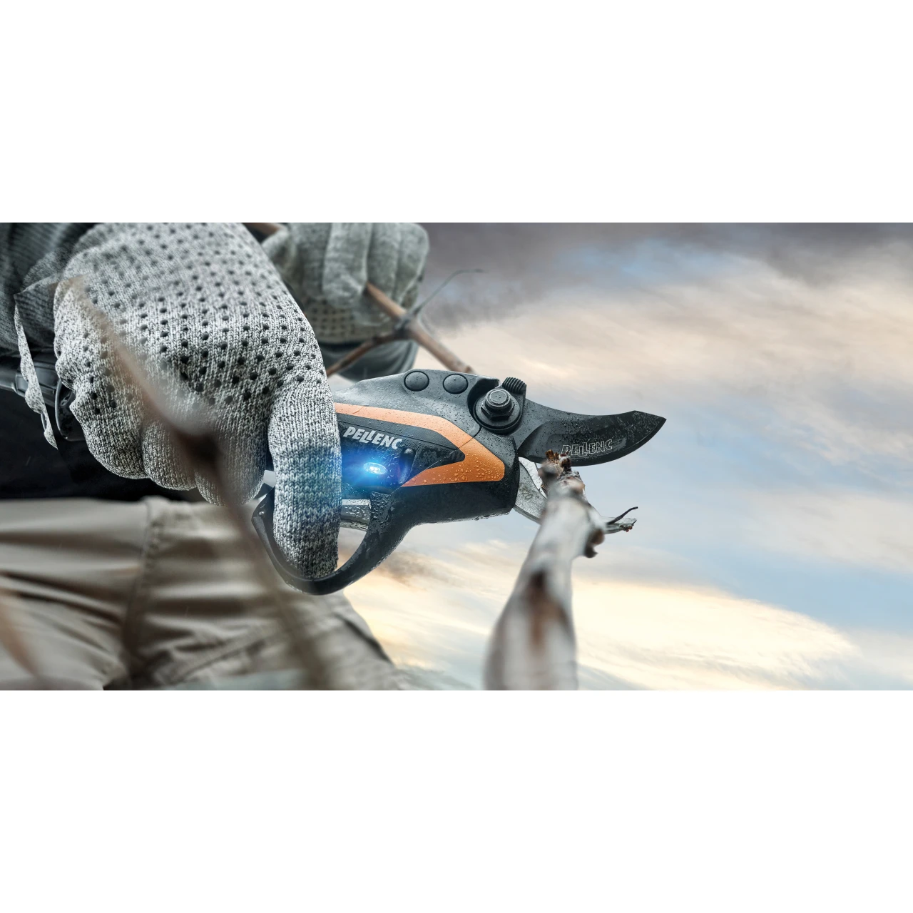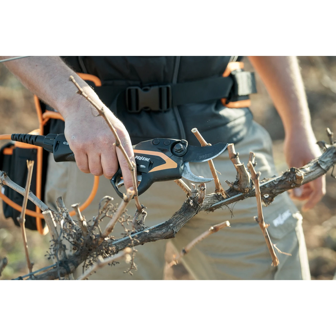 Diese neue Generation Rebscheren sind wahre Technologiekonzentrate und ermöglichen einen schnelleren und effizienteren Rebschnitt als je zuvor. Sie kombinieren geringes Gewicht mit Leistungsfähigkeit und passen sich dank des Schneidkopfs – 35 mm Durchmesser (Modell C35) oder 45 mm Durchmesser (Modell C45) – an die Dicke und die Härte des zu schneidenden Holzes an. An die Benutzersicherheit ist ebenfalls gedacht: die neue, von PELLENC patentierte Sicherheitsfunktion zum Schutz vor Schnittverletzungen namens Activ’Security stoppt bei Kontakt mit der Hand sofort die Klingenbewegung, unabhängig davon, ob Sie die PELLENC-Leithandschuhe tragen oder nicht.