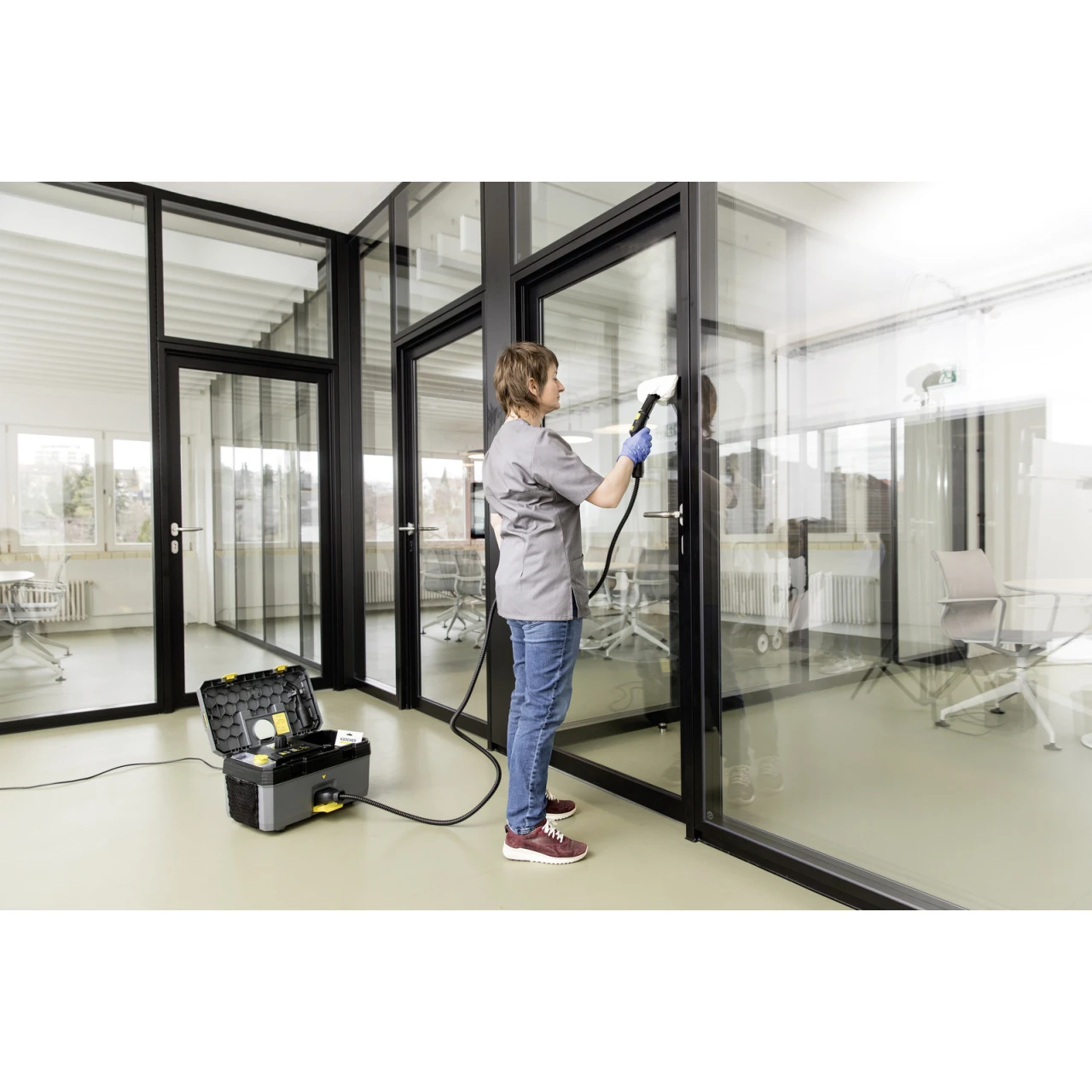 Dank des einzigartigen All-in-one-Box-Designs sehr kompakt, robust und langlebig, dazu umfangreich ausgestattet und besonders einfach zu bedienen: Der Dampfreiniger SG 4/2 Classic überzeugt mit exzellenten Reinigungsergebnissen, einem hervorragenden Preis-Leistungs-Verhältnis und maximaler Wirtschaftlichkeit. Das gerade mal 7,5 Kilogramm leichte Gerät ist der kompakteste professionelle Dampfreiniger seiner Klasse, in nur 3 Minuten einsatzbereit und bietet mit 4 Bar Dampfdruck mehr als ausreichend Reserven zur gründlichen Reinigung und Sanitation ganz ohne den Einsatz chemischer Hilfsmittel. Theken, Schankanlagen, Fliesen, Kochfelder, Öfen und vieles mehr werden bis in die kleinste Ritze makellos sauber – ganz unabhängig von ihrem Verschmutzungsgrad. In besonders hartnäckigen Fällen hilft die zuschaltbare VapoHydro-Funktion mit Heißwasser und beseitigt wirksam auch starke Verschmutzungen und Fette, der Wassertank ist entnehmbar und jederzeit befüllbar. Mitgelieferte Zubehöre wie Dampfschlauch, Handdüse, Punktstrahldüse, Powerdüse, Rundbürste, Flachbürste, Dampfschaber und Mikrofaser-Überzug sind alle direkt im Gerät untergebracht – optional ist auch eine Bodendüse erhältlich.