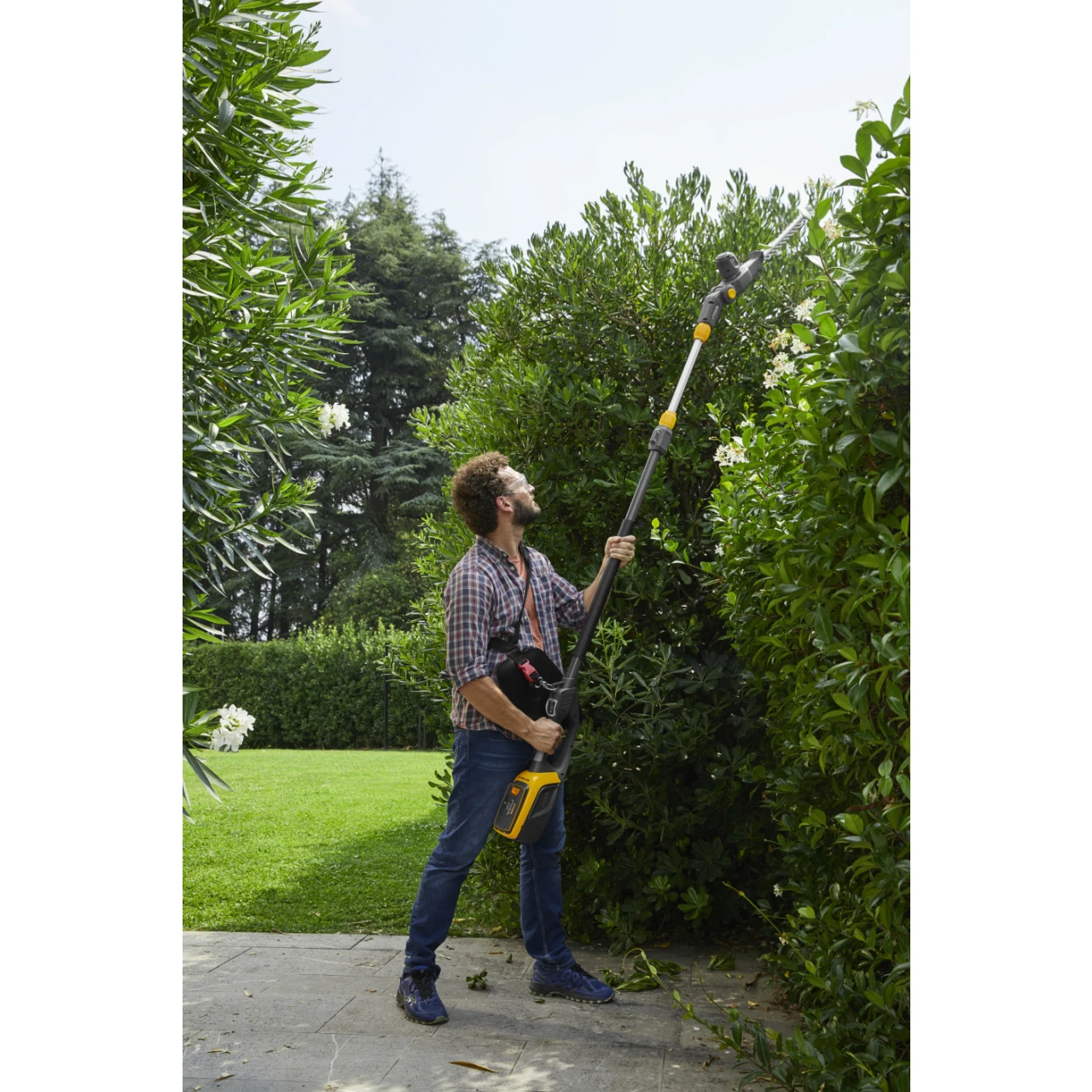 Das mit einem Teleskopschaft und einem Aufsatz für eine Heckenschere und Kettensäge ausgestattete leichte und leistungsstarke Multitool MT 500e erleichtert Trimm- und Schnittarbeiten in schwierig zugänglichen Büschen und Bäumen. Mit dem 112°-Drehgriff finden Sie leicht eine für Sie bequeme Arbeitsposition.